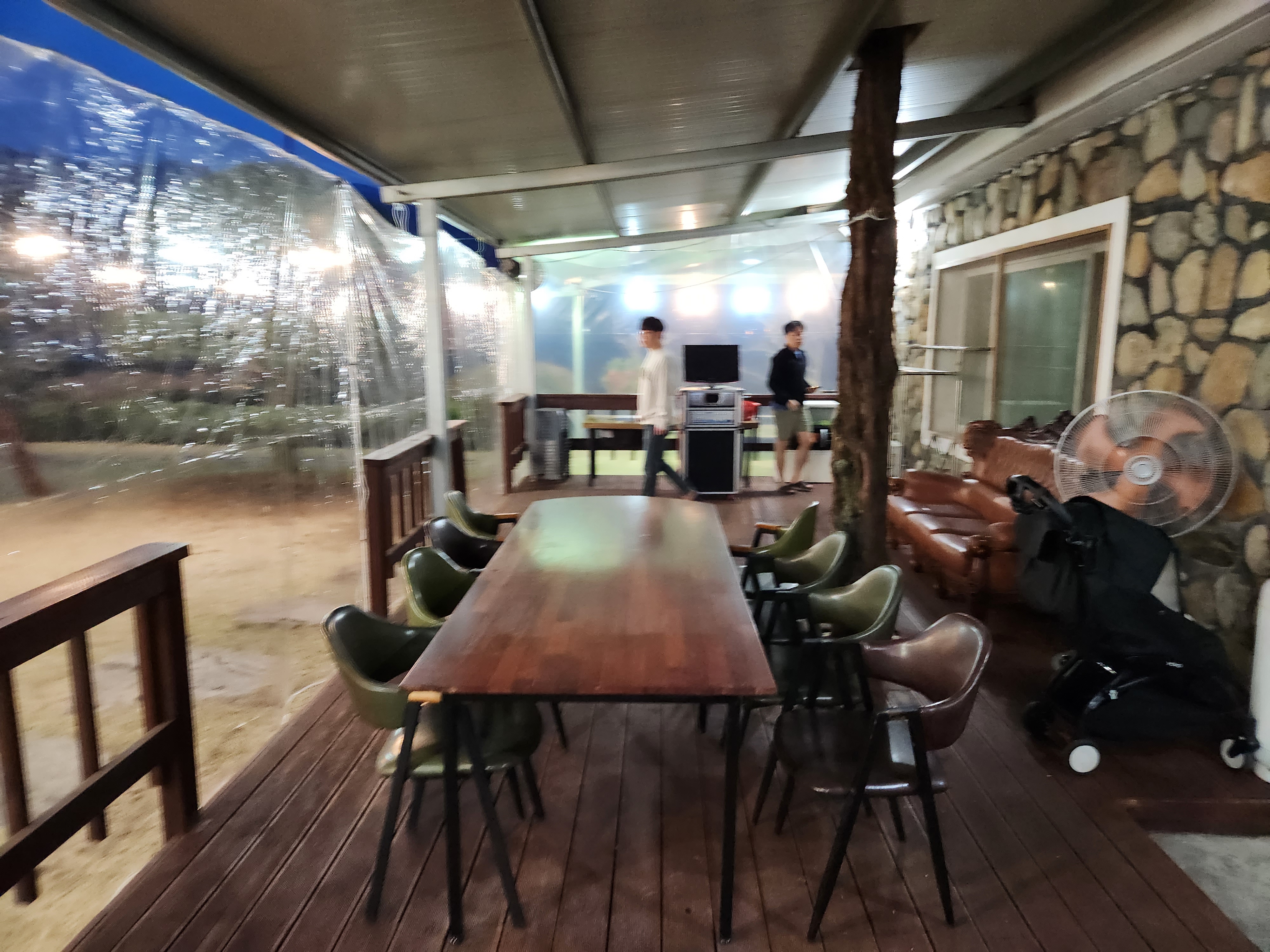 테이블이 넓어서 좋았다. 8명까지 넉넉하게 앉을 수 있었다. 데크 안쪽은 다른 방 사람들 꺼였는데, 뒤쪽에 전자레인지도 사용할 수 있었다.