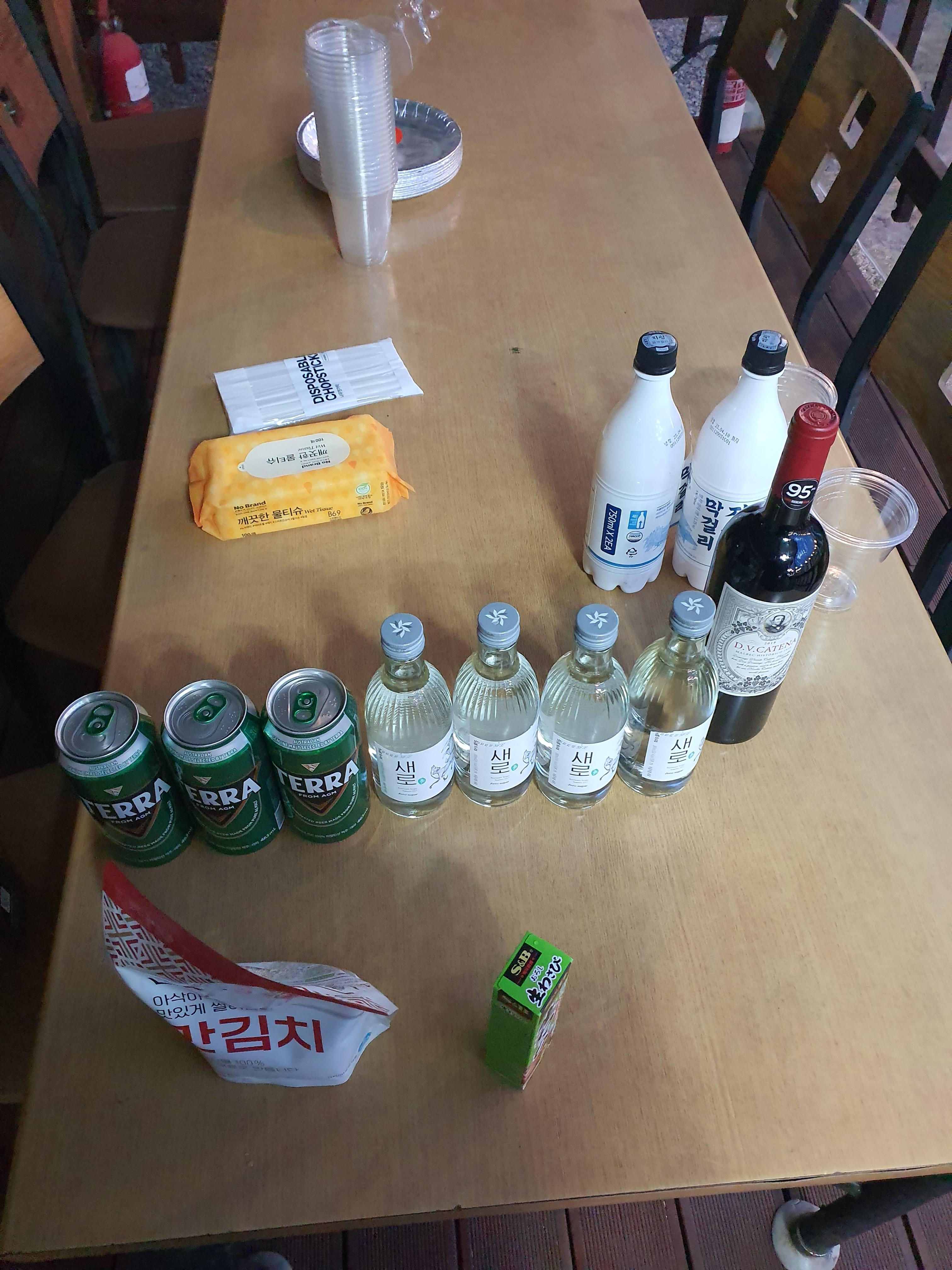 오늘의 주종은 와인, 막걸리, 맥주는 입가심, 메인은 소주이다.